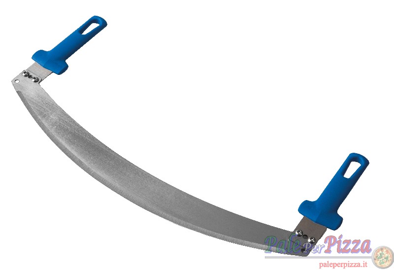 Rocker cutter for pizza cutting, in stainless steel. Of great scenic effect for cutting in front of clients. Double use modality: handle blocked or rocking handle for simple and natural movements. Handles in special polymer high resistant to heat, impact and cut resistant. Blade dimensions 53×26 cm.