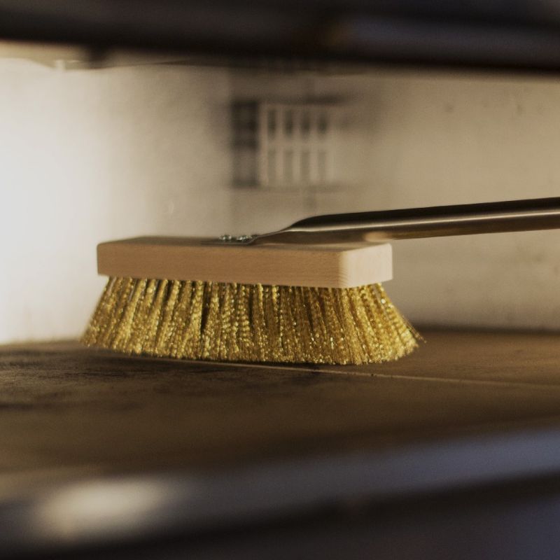 Brush with brass bristles and stainless steel tubular handle. Grip and handle base in high-density polymer to prevent transmission of oven heat. Practical and hard-wearing brush.