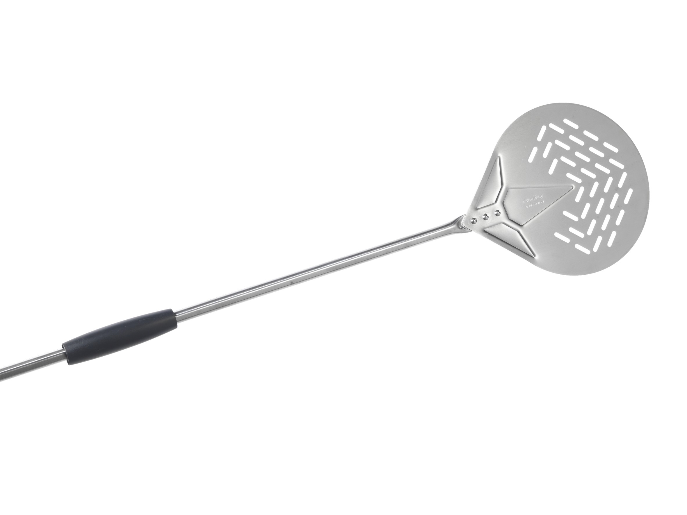La pelle à défourner fendue entièrement en acier inox évite la transmission de la chaleur du four. L’extrémité du manche et la poignée intermédiaire souple sont en polymères spéciaux de haute densité, hautement résistants aux chocs et à la chaleur. Une languette spéciale à l’extrémité du manche permet de bloquer la poignée intermédiaire et l’avoir à disposition prête en haut quand la pelle est appuyée la tête en bas.