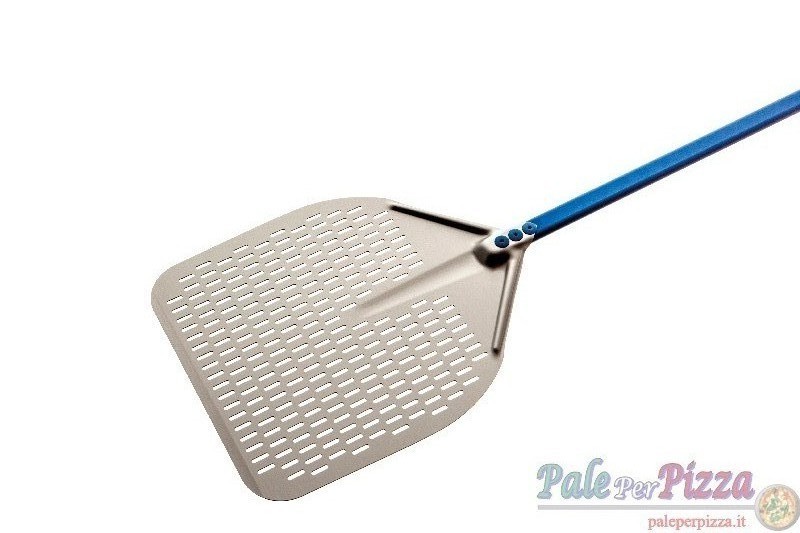Pelle avec tête en aluminium anodisé neutre et manche en aluminium bleu. Moins lourd que les modèles classiques mais d’une grande robustesse avec le manche tubulaire ovale qui augmente la stabilité. La tête légère et flexible offre l’efficacité d’une spatule avec des nervures qui garantissent le maintien ; l’anodisation neutre offre une surface homogène et anti-oxydation ; le fraisage lisse et régulier facilite la sortie de la pizza. Le raccord de la tête au manche est formé par la superposition des deux éléments fixés par trois gros rivets alignés qui garantissent la sécurité et la stabilité, en plus de l’absence de vibrations dans le manche, ce qui augmente le confort d’utilisation. La fente diminue le frottement et évacue la farine, pour éviter qu’elle ne colle à l’envers de la pizza et ne brûle.